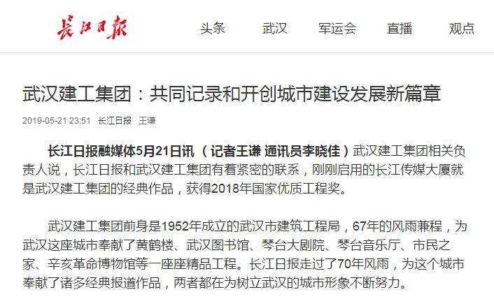 長江日報融媒體5月21日訊 (記者王謙 通訊員李曉佳)武漢建工集團(tuán)相關(guān)負(fù)責(zé)人說,長江日報和武漢建工集團(tuán)有著緊密的聯(lián)系,剛剛啟用的長江傳媒大廈就是武漢建工集團(tuán)的經(jīng)典作品,獲得2018年國家優(yōu)質(zhì)工程獎。