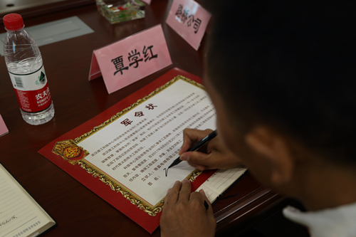 動(dòng)員大會結(jié)束后,由各參建單位簽訂軍令狀,保證項(xiàng)目按期完成各項(xiàng)節(jié)點(diǎn),順利交付使用。最后,由富強(qiáng)公司總經(jīng)理程曦與華達(dá)裝飾公司負(fù)責(zé)人張波完成武漢建工科技中心項(xiàng)目部“大戰(zhàn)一百天”動(dòng)員會揭牌儀式。