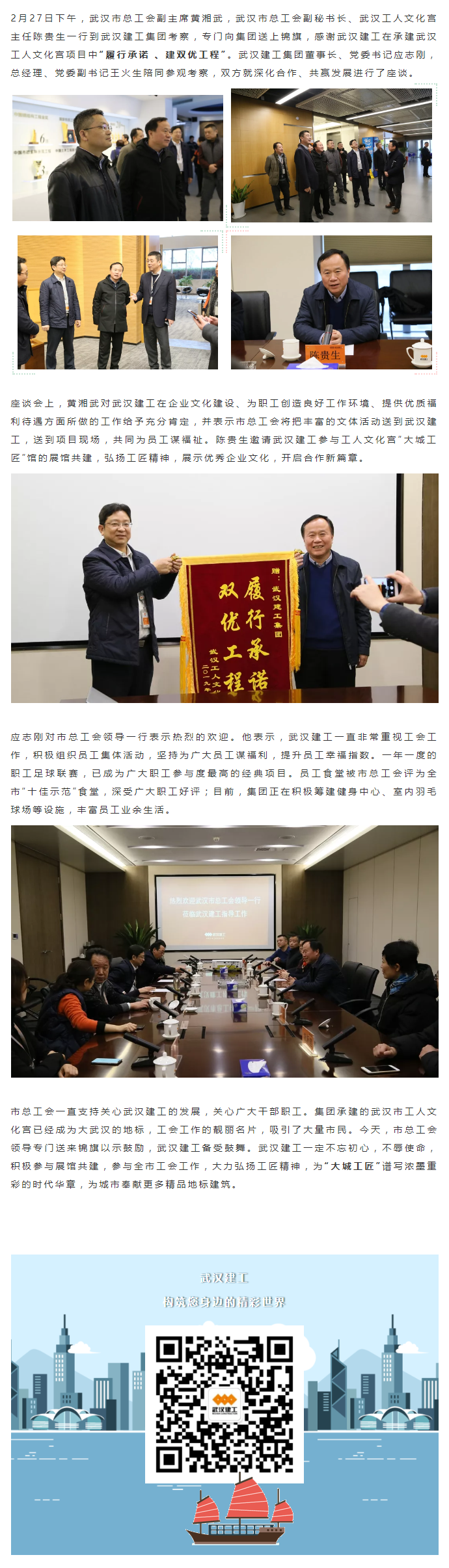 2月27日下午,武漢經濟技術開發(fā)區(qū)工委副書記、管委會主任彭浩帶領區(qū)工委領導班子成員和開發(fā)區(qū)有關職能部門負責同志一行到武漢建工科技中心調研武漢建工集團,并召開了座談會。武漢建工集團董事長、黨委書記應志剛,總經理、黨委副書記王火生和集團、股份公司領導班子成員參加了調研座談。
